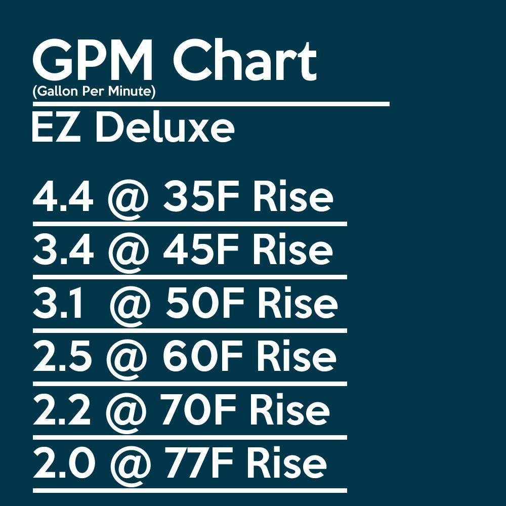 The EZ Deluxe is a whole home water heater designed for the typical household of 1-2 bathrooms. Averaging between 3 – 4 gallons per minute, it supplies more than enough hot water to run any one hot water tap at a time, and in some cases two. The EZ Deluxe is also a self regulating water heater, meaning the heater automatically adjusts the burners according to the water flow to ensure the desired temperature is reached at your tap. For instance, the average sink tap runs about 1 gallon per minute while the average shower head runs about 1.7 – 2 gallons per minute. With the EZ Deluxe you simply set the temperature on the screen and the unit does the rest of the work for you!